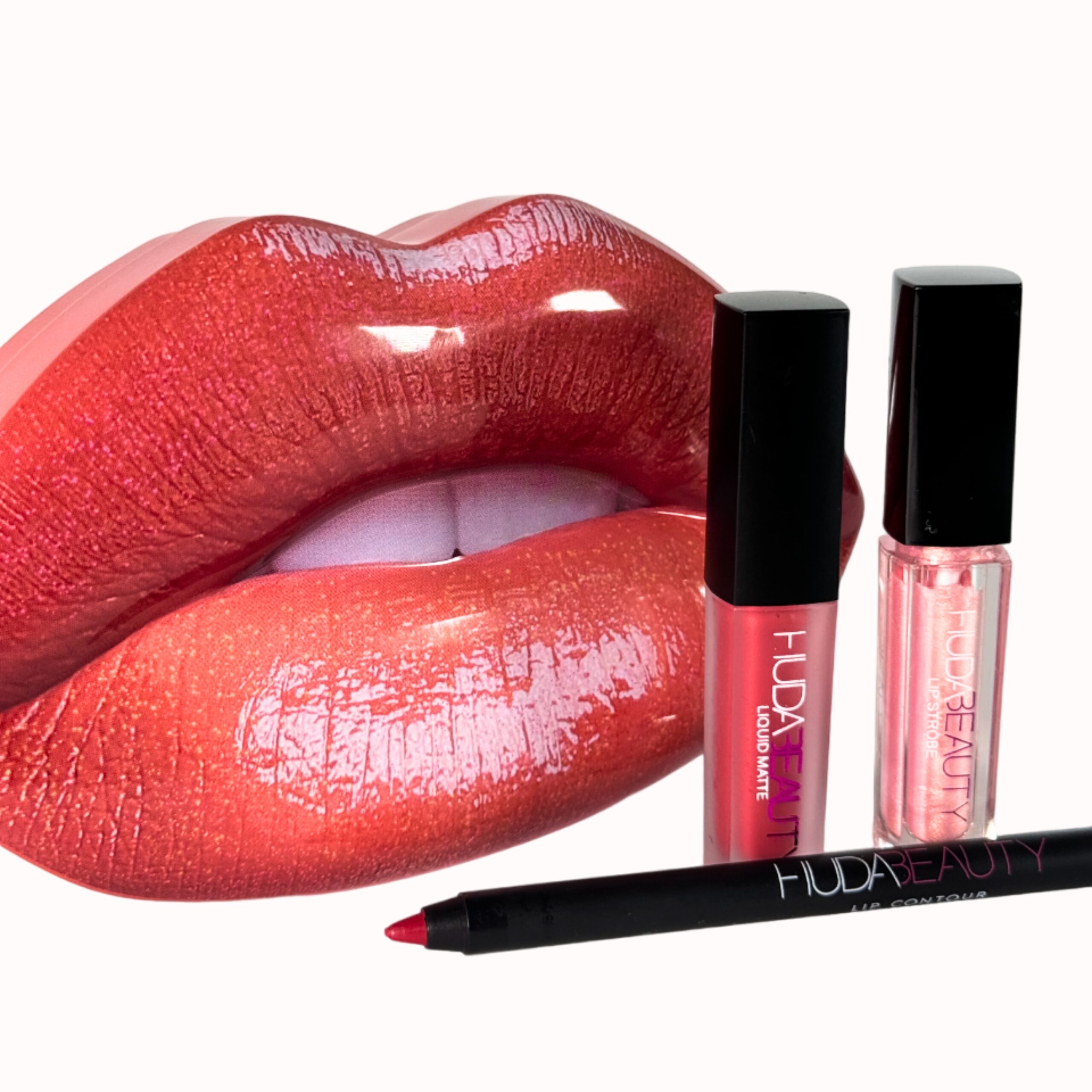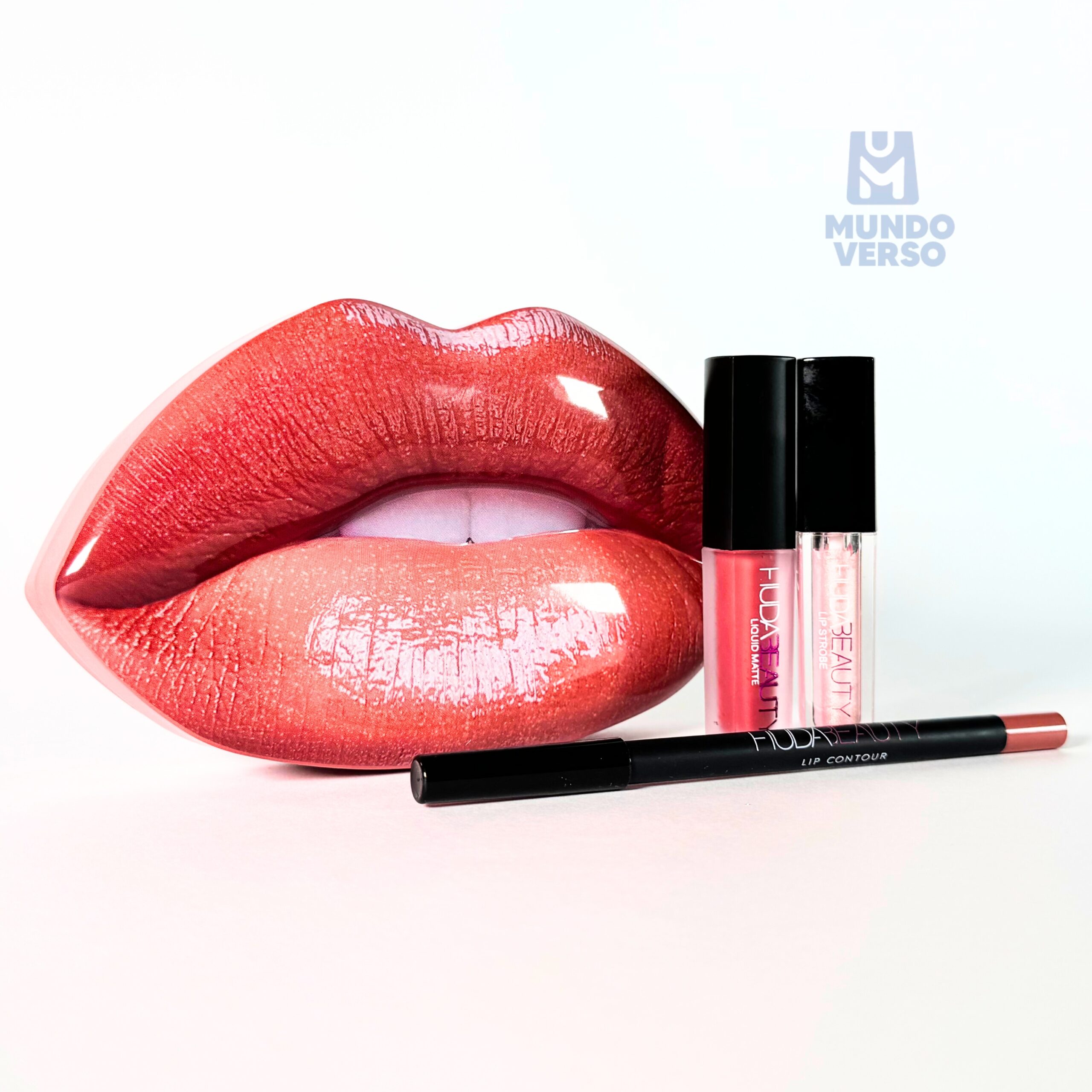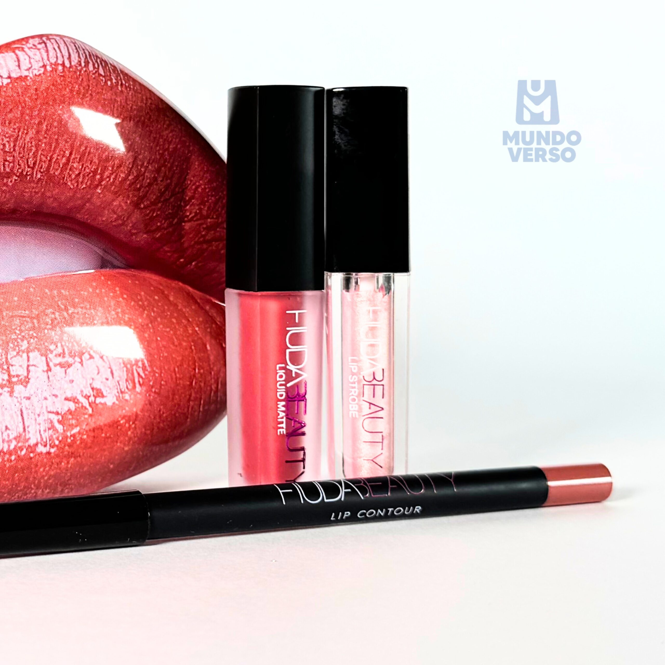 Realza la belleza de tus labios con este completo kit de 3 piezas. Incluye un lápiz delineador, un labial mate y un gloss brillante.